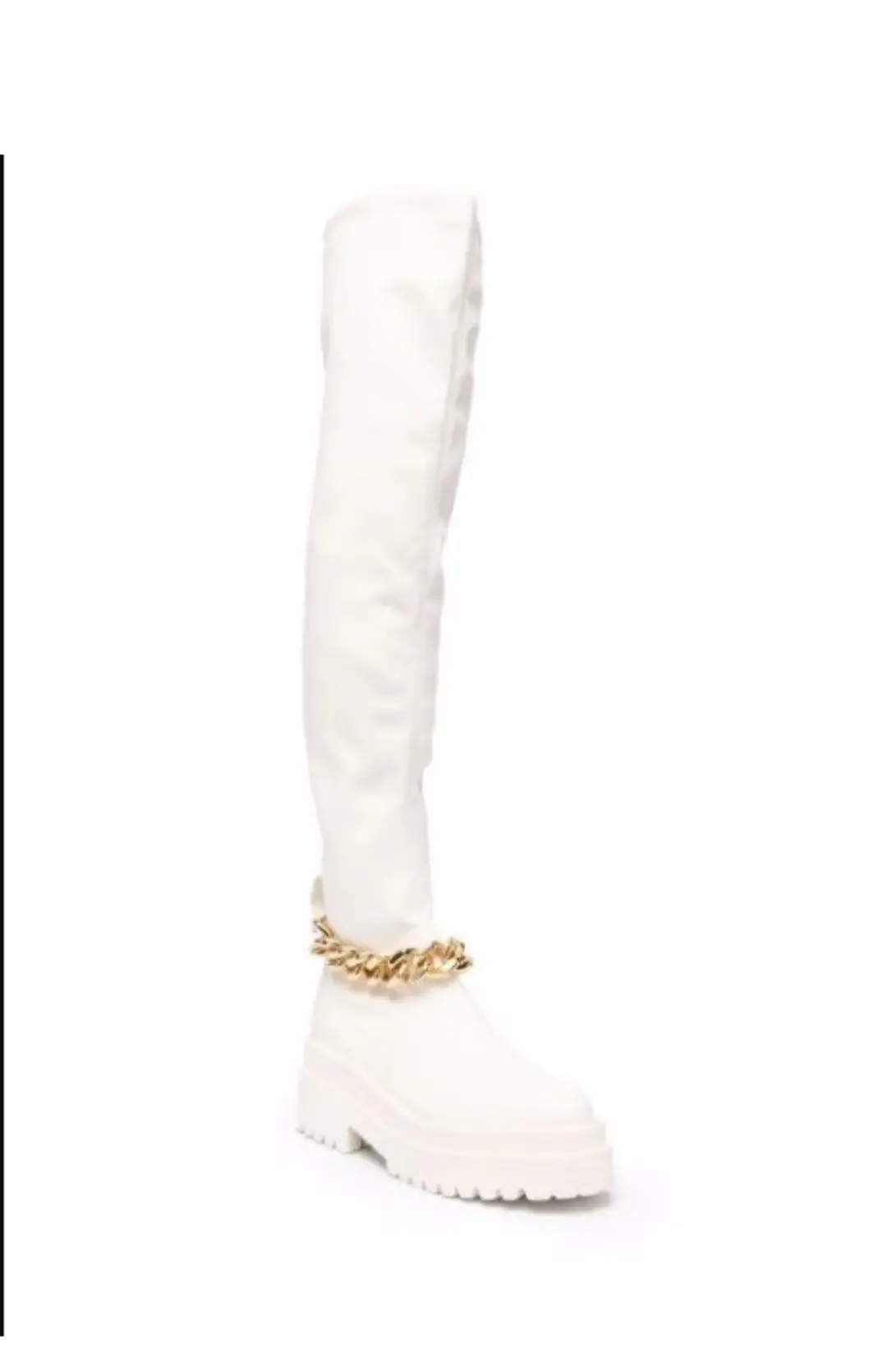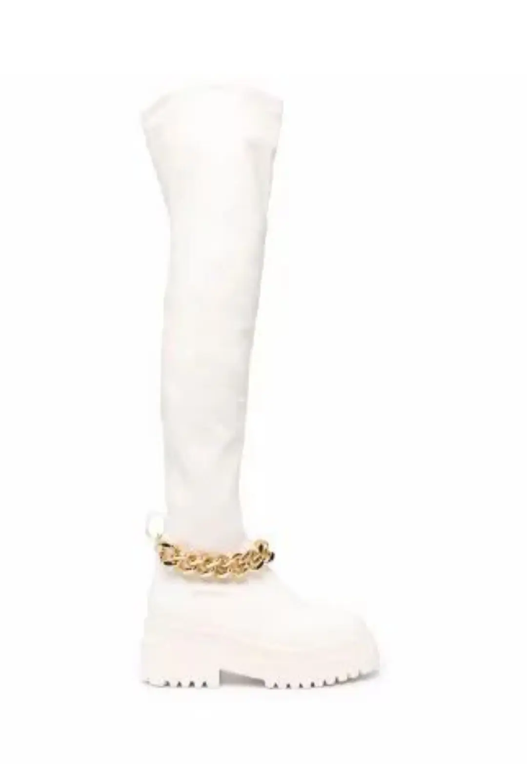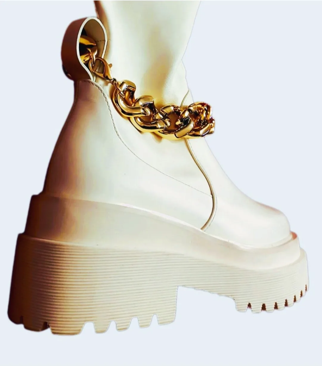 Высота голенища 57см+каблук 7 см, платформа 4 см, на молнии , декоративная золотая цепь с карабином.